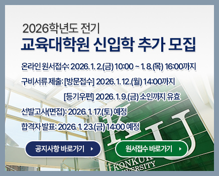 [추가모집(재교육과정)] 교육대학원 2026학년도 전기 신입생 추가모집 안내교육대학원 2026학년도 전기 신입생 추가모집 안내★재교육과정만 모집 (진로진학상담전공 부전공 취득과정 포함)[원서접수 및 구비서류 제출]★원서접수 방법: 인터넷 접수(유웨이어플라2025.12.26